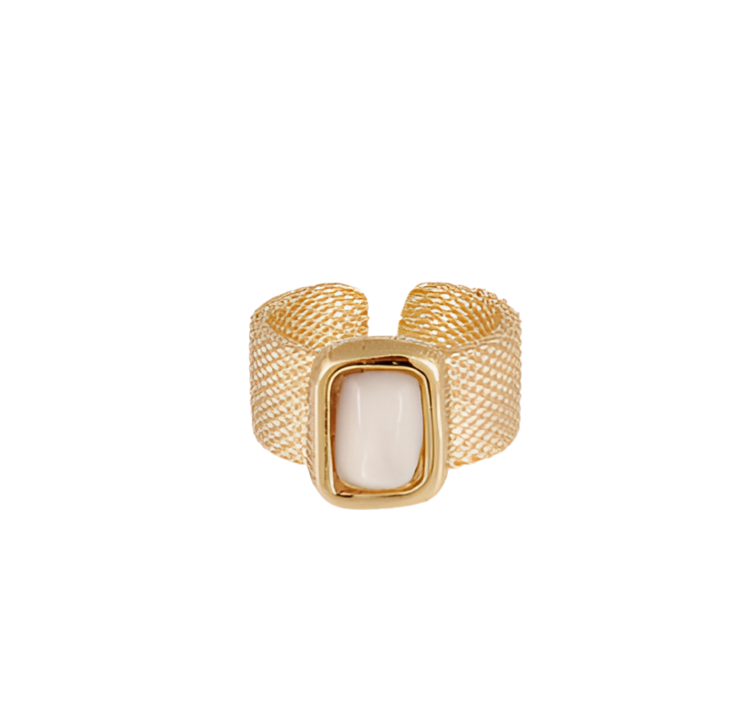 Ring composed of a gold plated mesh finely assembled and adorned with a medallion embellished with white Mother-of-pearl.