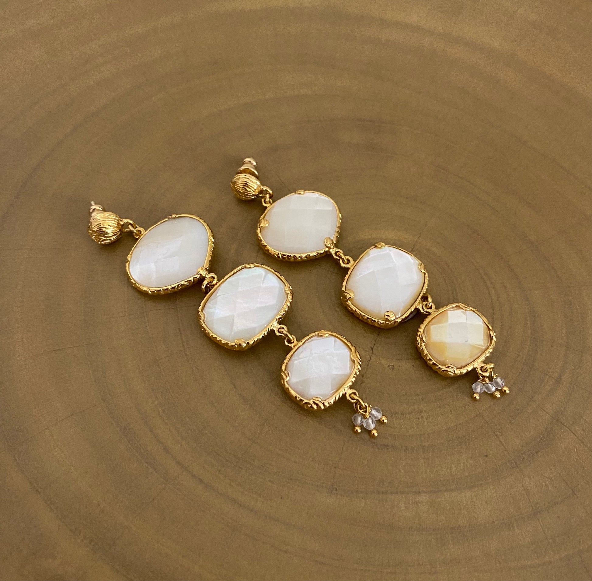 Gold plated earrings embellished with three white Mother-of-pearl set on a stud.