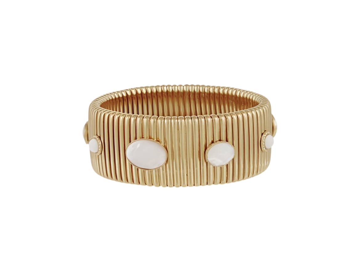 24k gold plated flexible bracelet adorned with Mother of pearl studs.