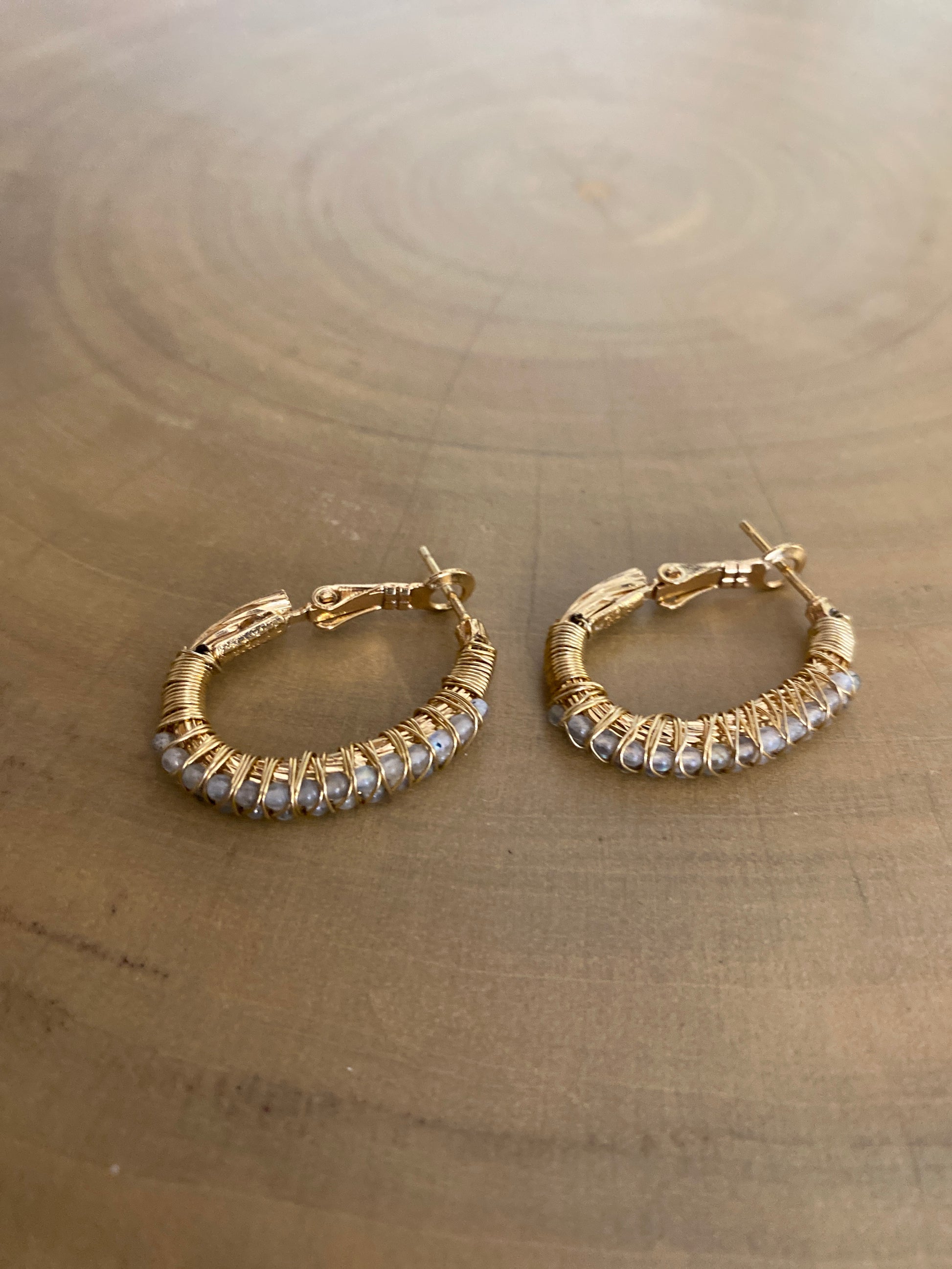 Delicate gold-plated hoop earrings adorned with Labradorite. The Lyre hoop earrings, jewels woven with light, celebrate the art of thread. A metal thread is wrapped around the stones in a meticulous and precious gesture. Inspired by artisanal weaving, they embody the expertise of our Maison Atelier.