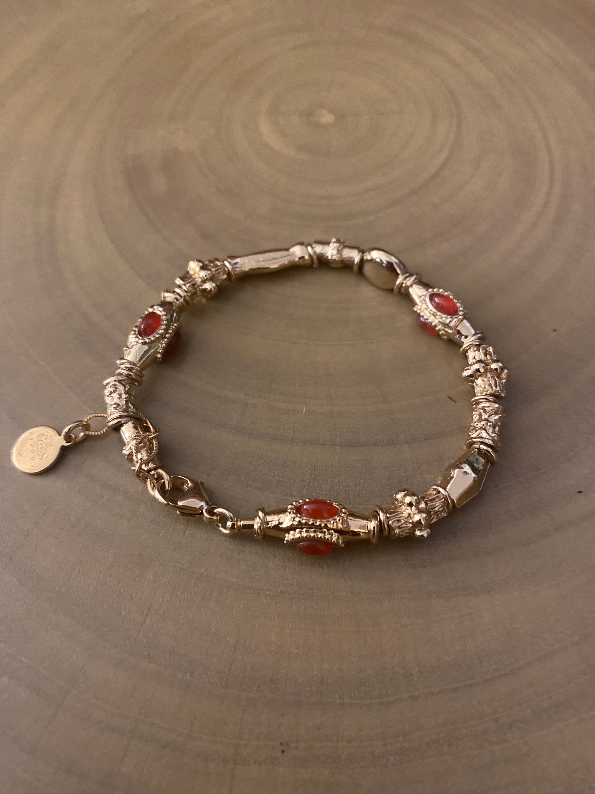 Gold plated bracelet, composed of various glass and gemstones beads and adorned with gold plated rings set with gemstones.