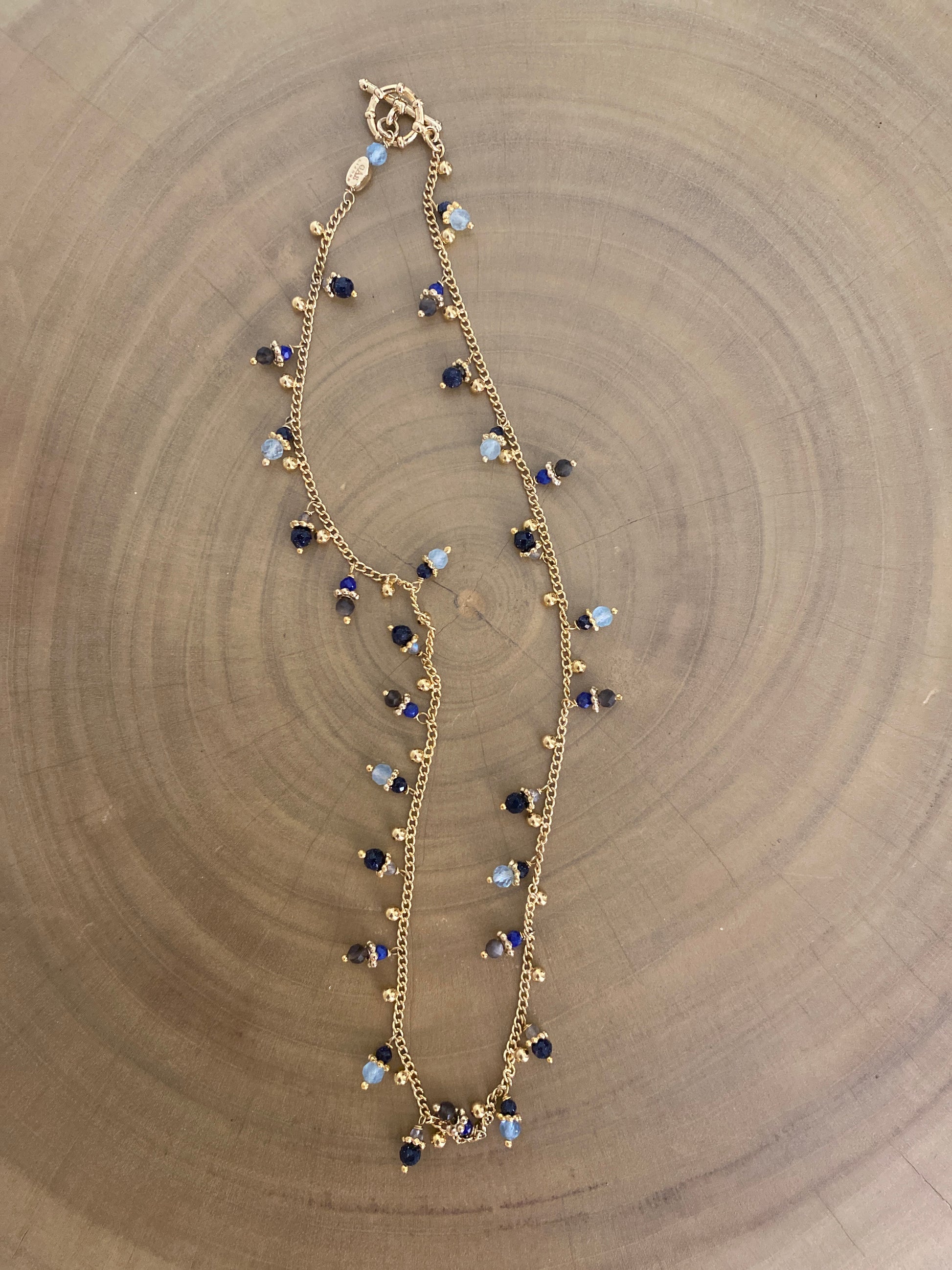 Gold plated necklace adorned with delicate colored gemstones and pearls.
