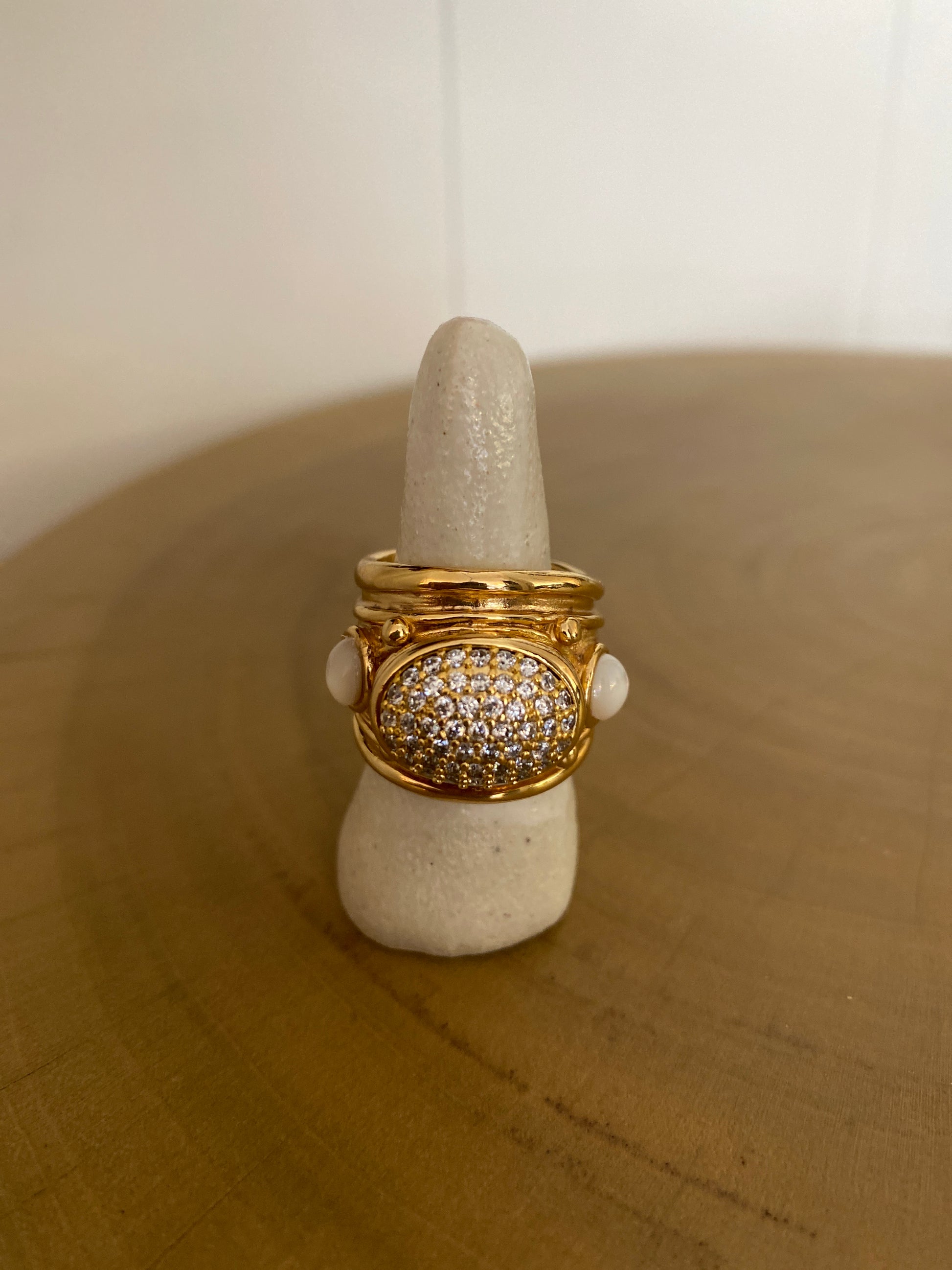 Gold-plated Simone ring set with three hand-cut gemstones, a large cabochon on the front with zirconium and two small cabochons on the side with mother of pearl.