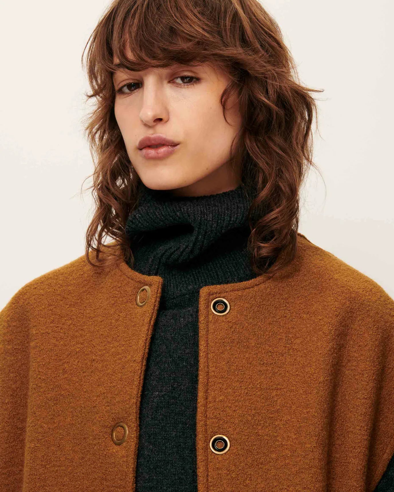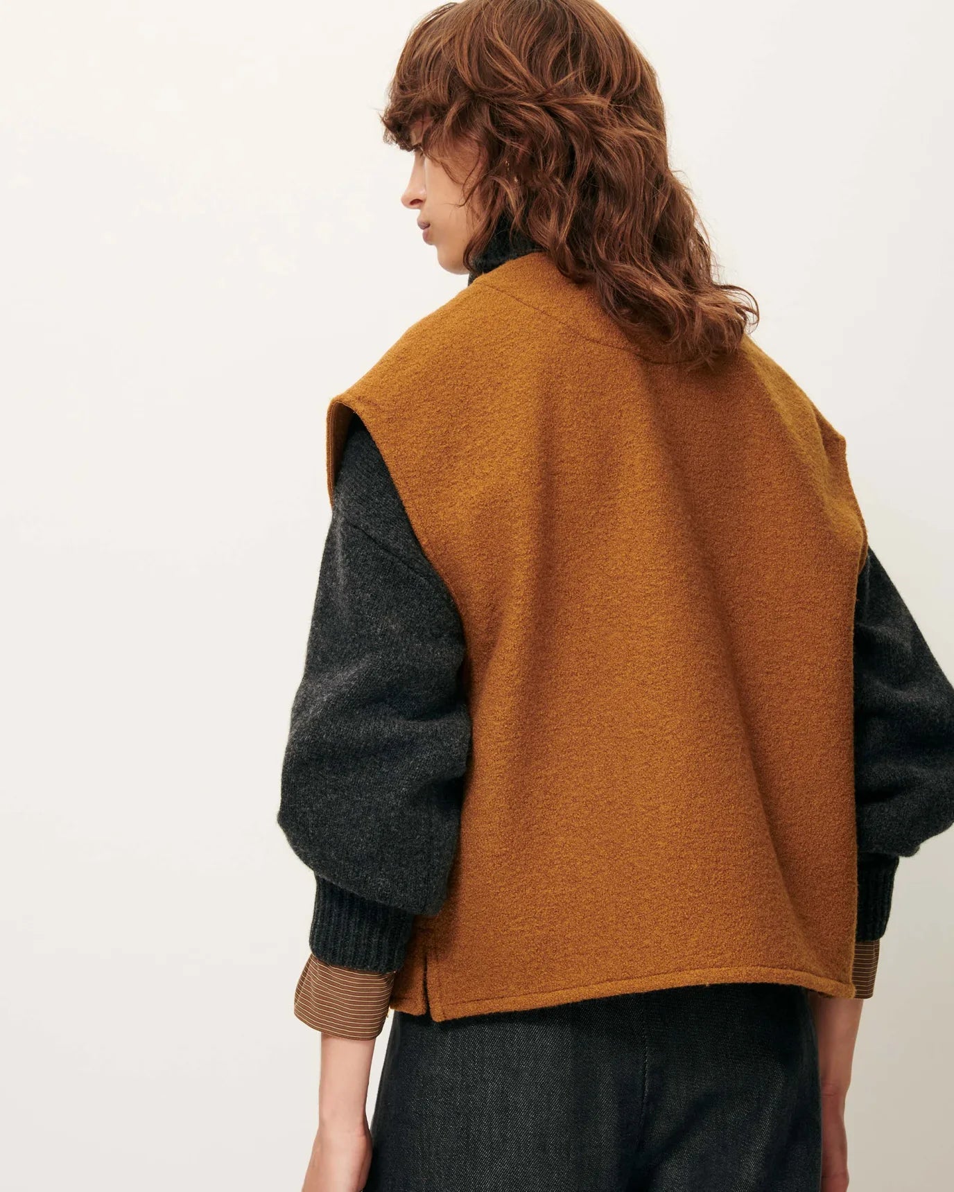 Sleeveless jacket in boiled wool. Eyelet snap details.