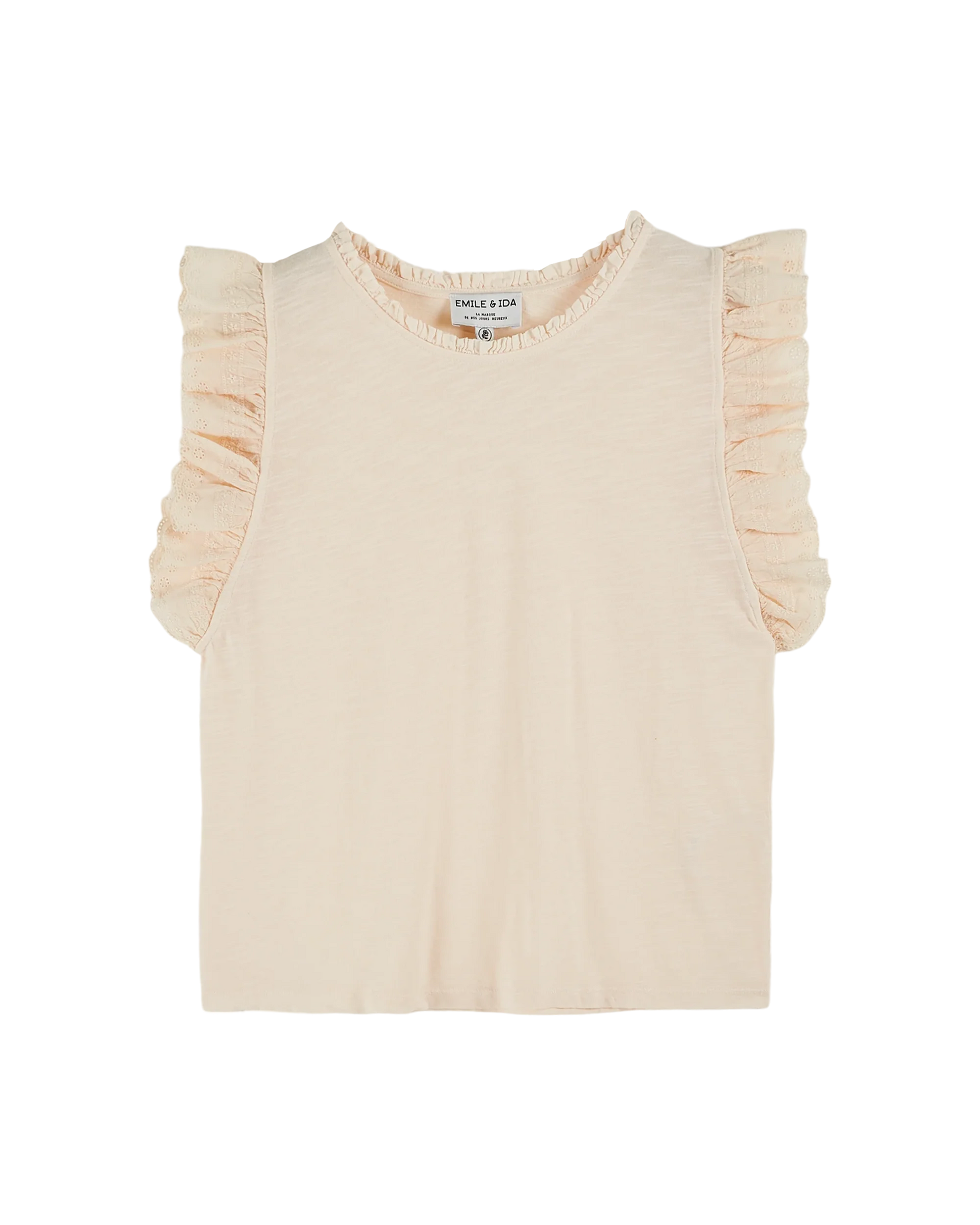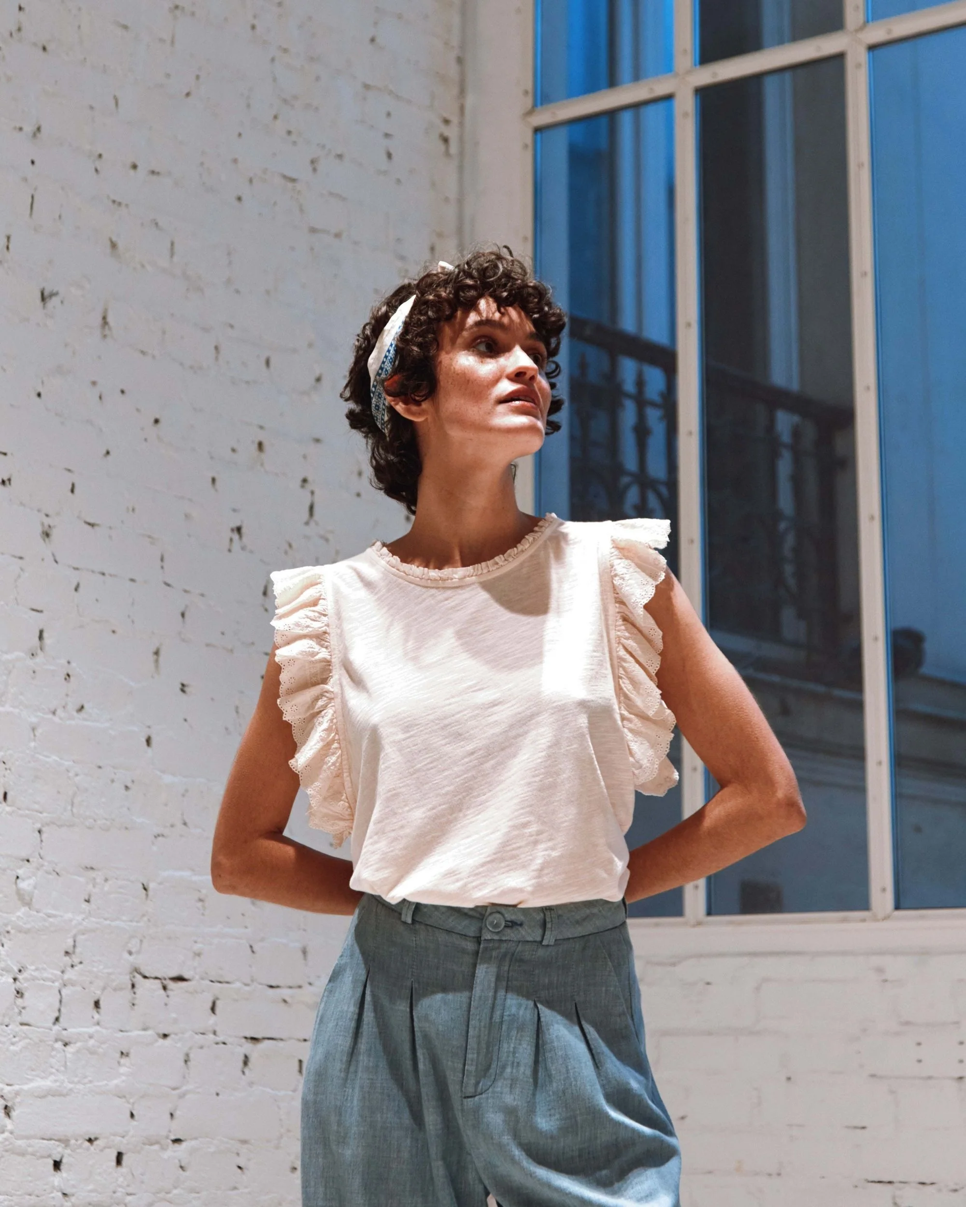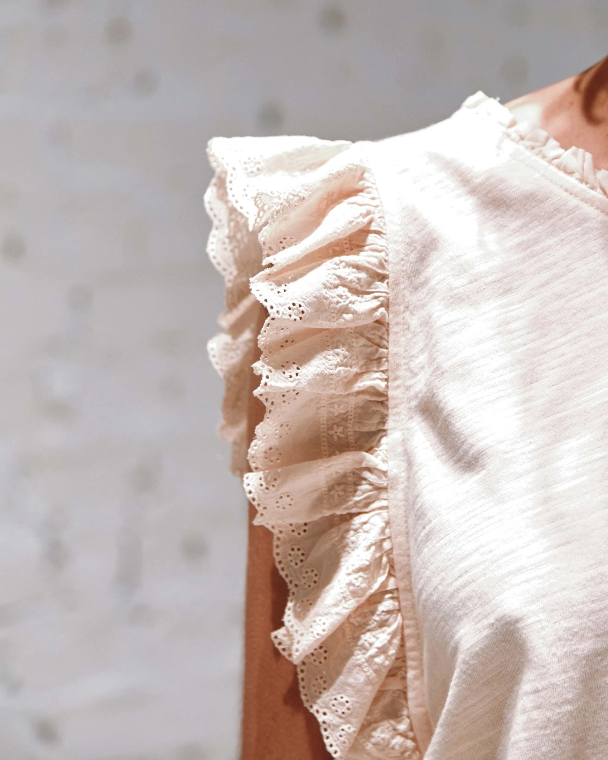 The round neckline is enhanced by a cotton voile frill, adding a romantic touch that runs down to the hemmed, topstitched hem. The tone-on-tone broderie anglaise ruffles that replace the sleeves add a discreet, airy sophistication.
