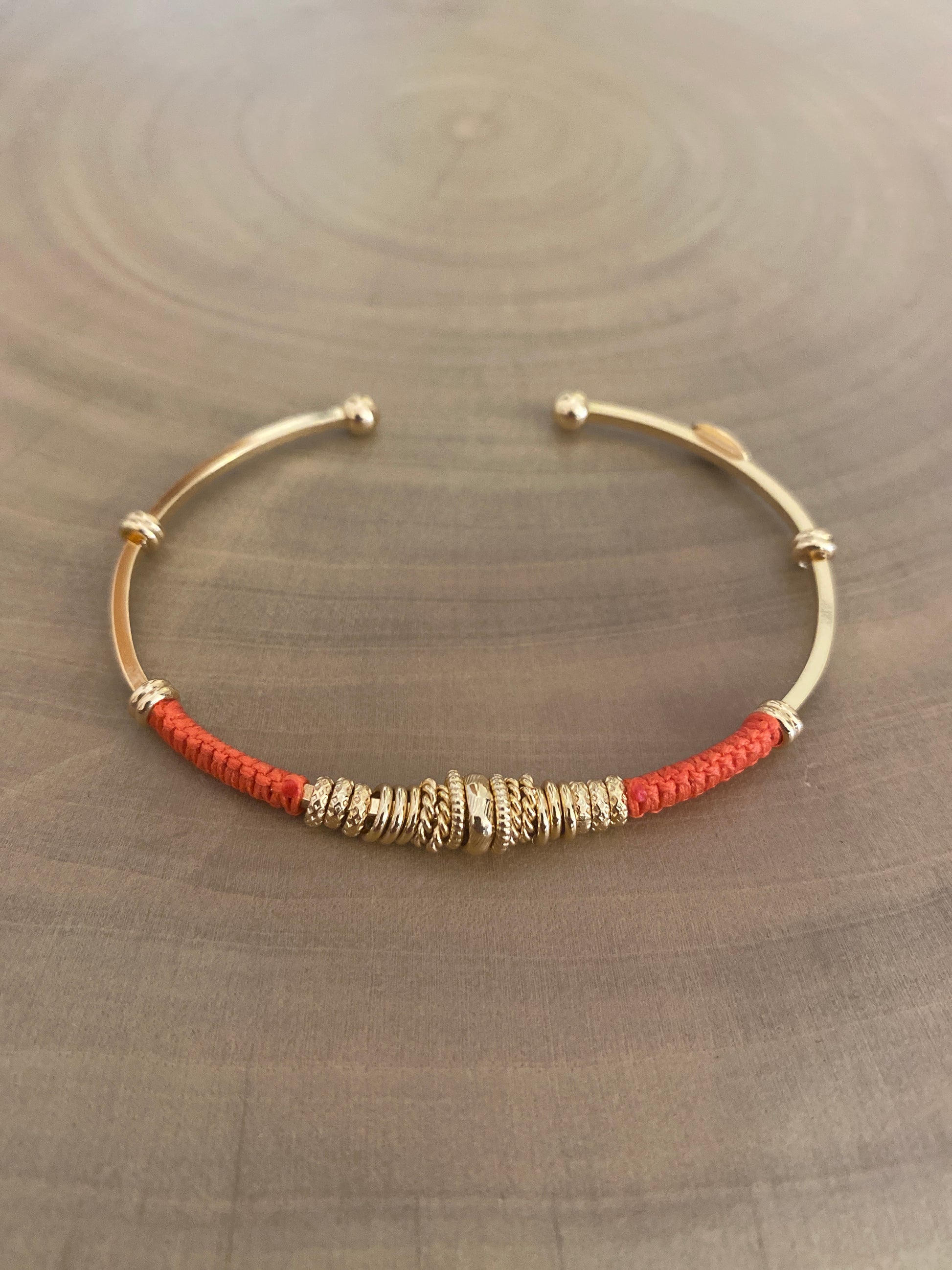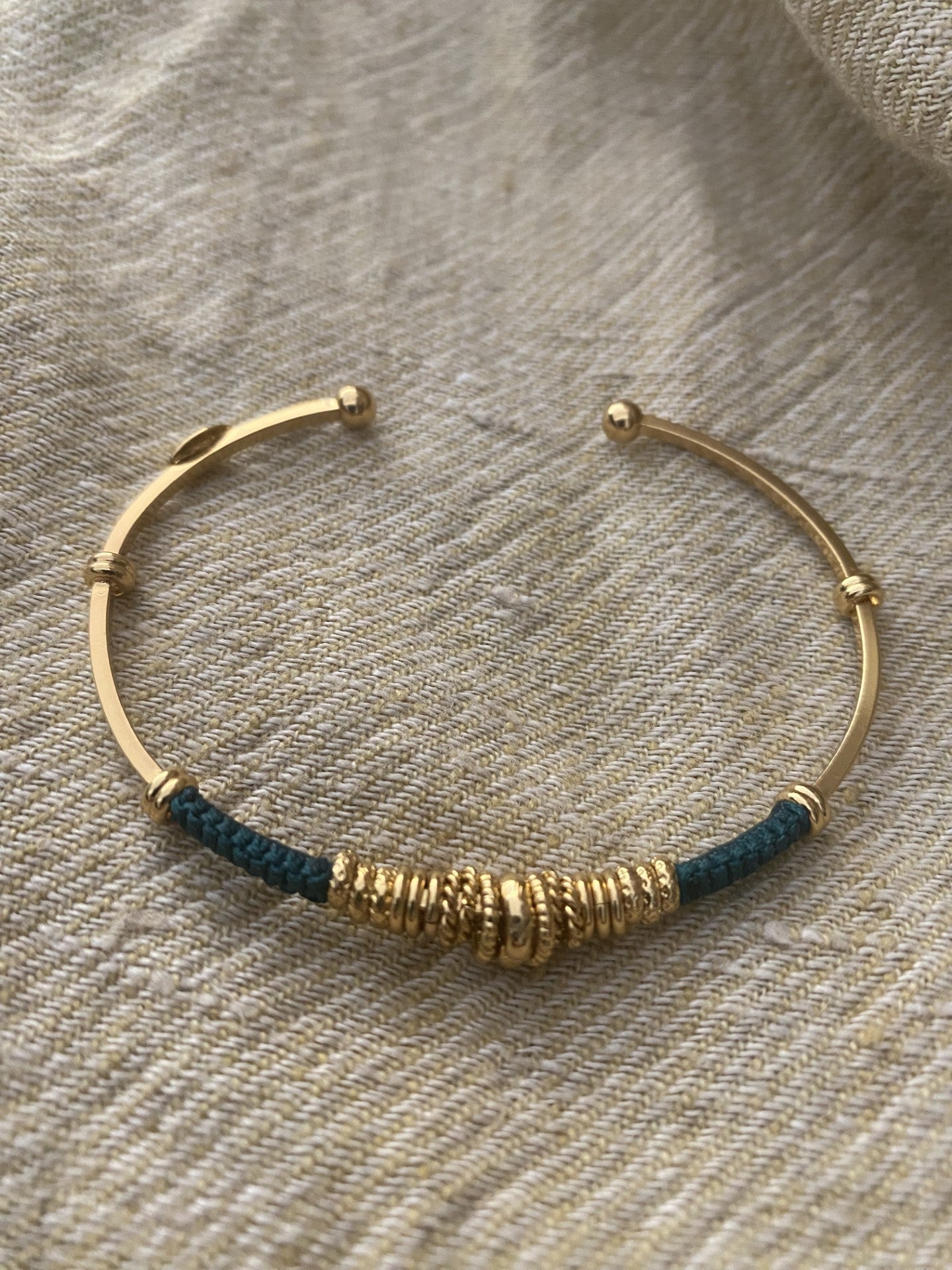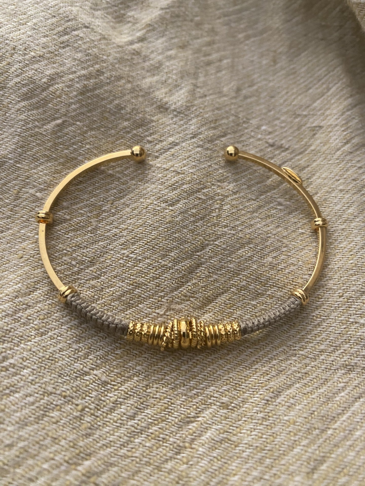 One Gold plated bangle, wrapped in part by cotton threads and golden plated adornments. You can stack it with other bracelets to create a summery arm candy. Adjustable size.