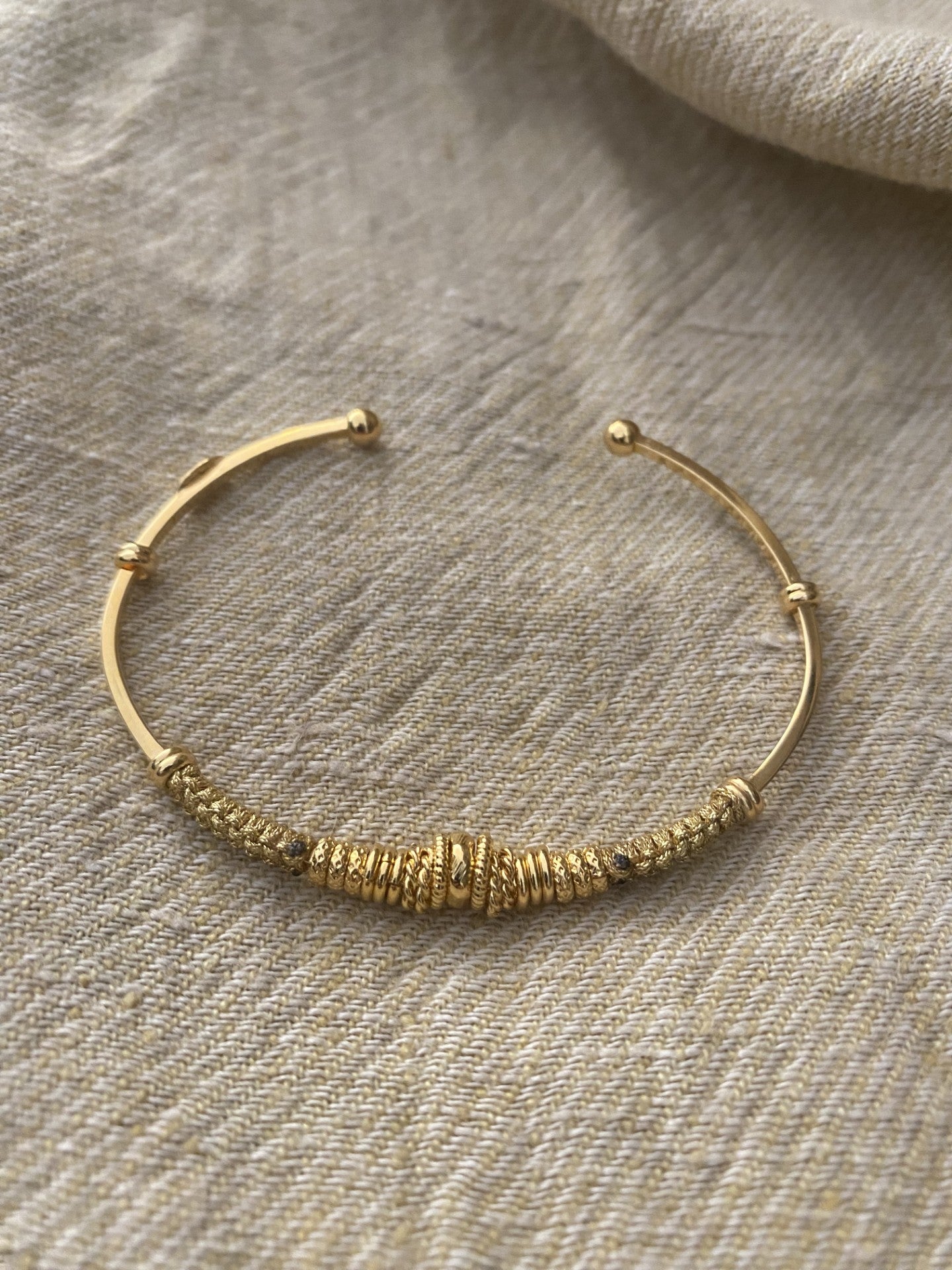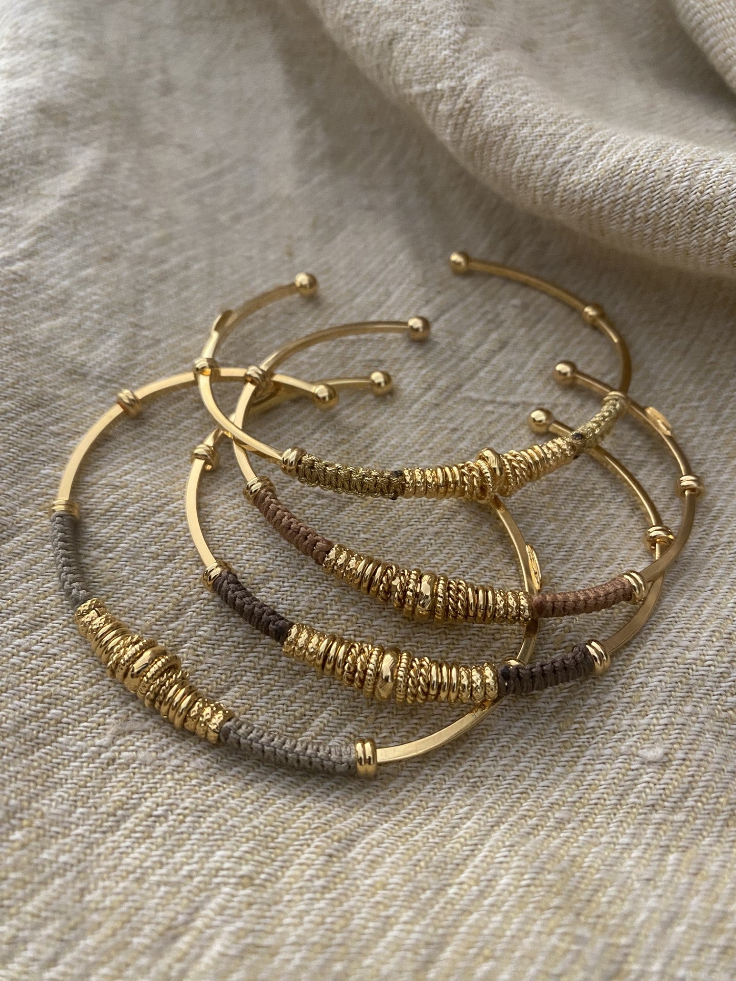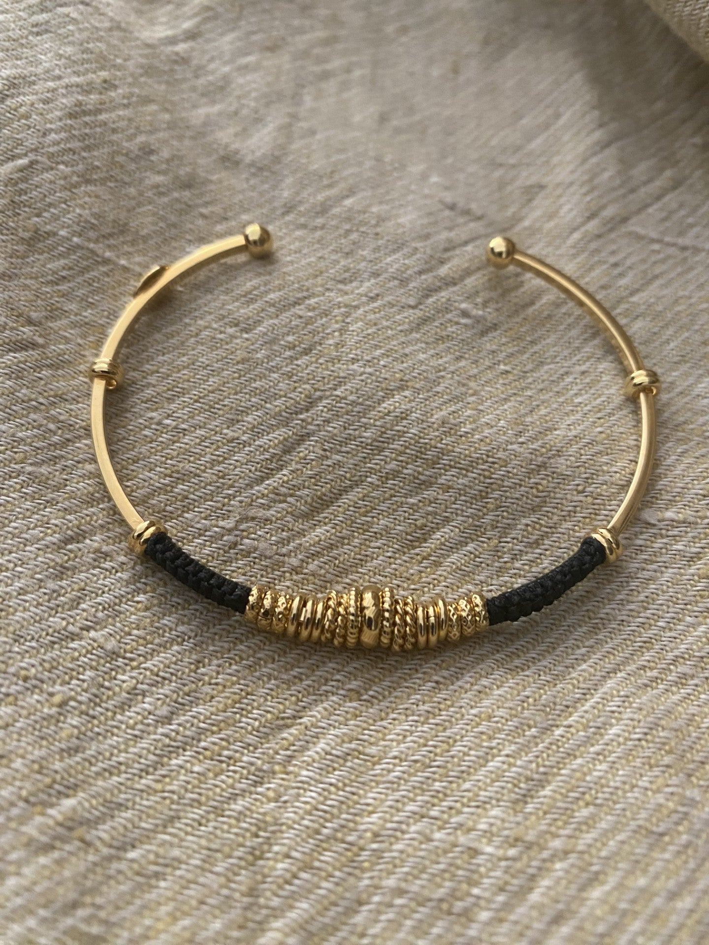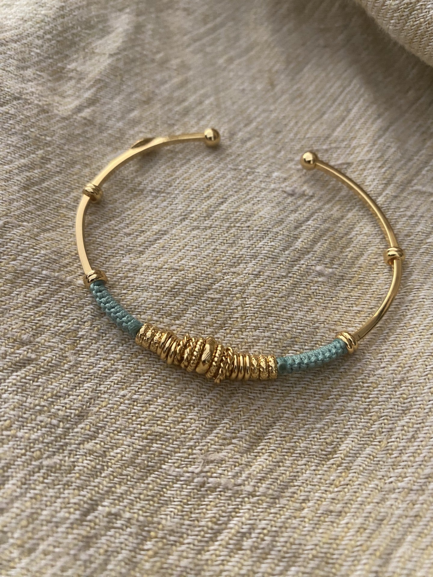 One Gold plated bangle, wrapped in part by cotton threads and golden plated adornments. You can stack it with other bracelets to create a summery arm candy. Adjustable size.