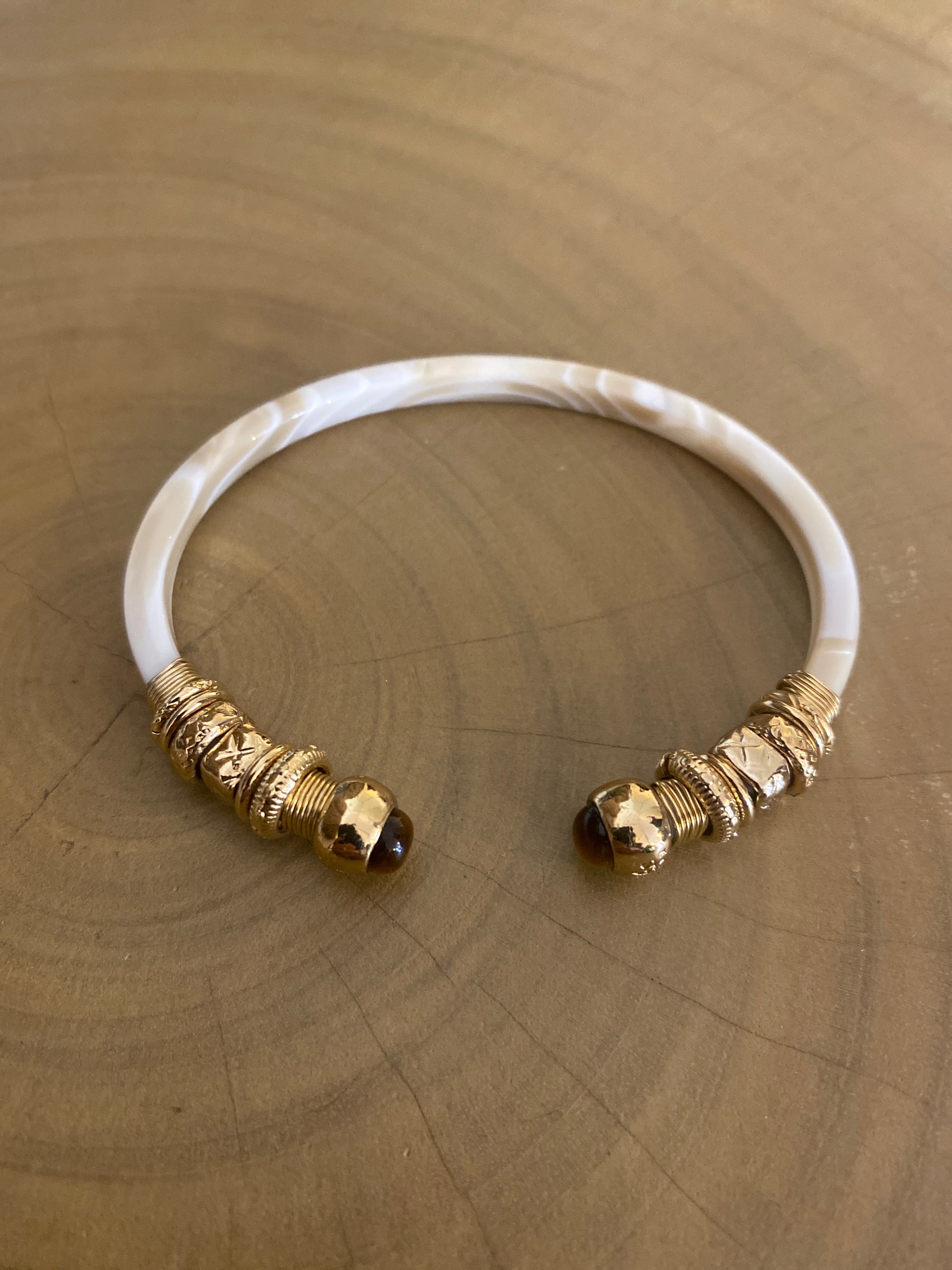 Gas Bijoux Acetate bracelet hand-wrapped with gold-plated wires and rings. This bracelet is finished with two golden balls set with fine stones at the ends.