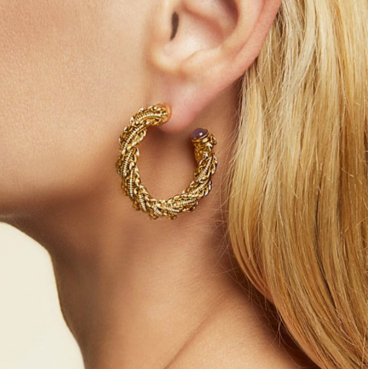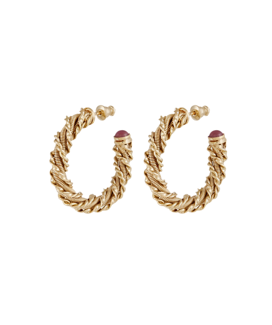 Gas Bijoux Gold plated twisted earrings embellished with threads and adorned with brown cabochons.