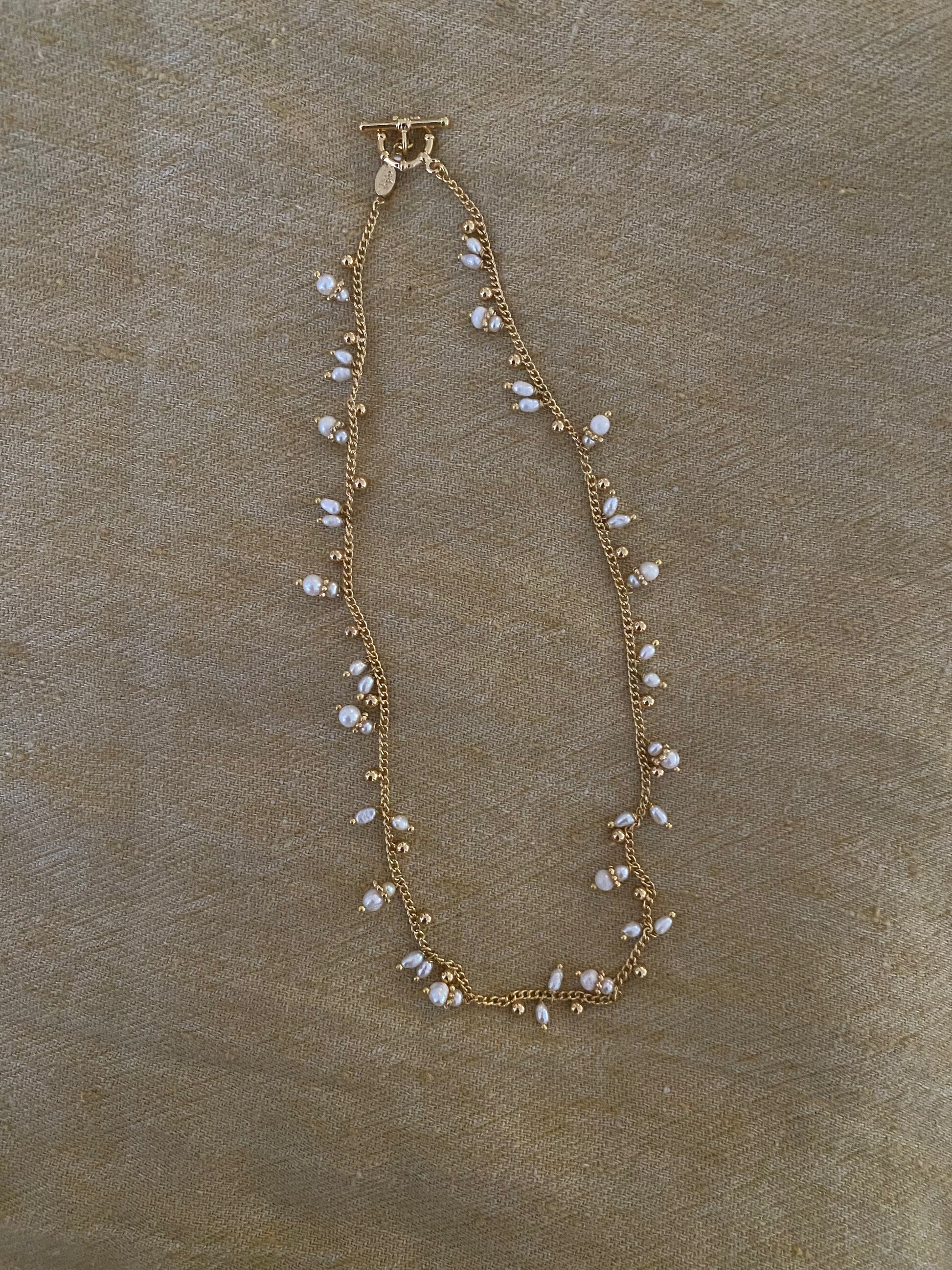 Gold plated necklace adorned with delicate gemstones white mother of pearls