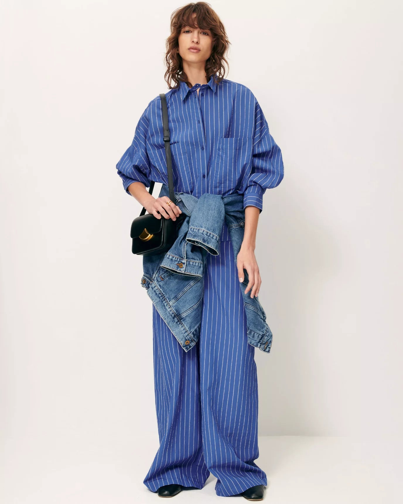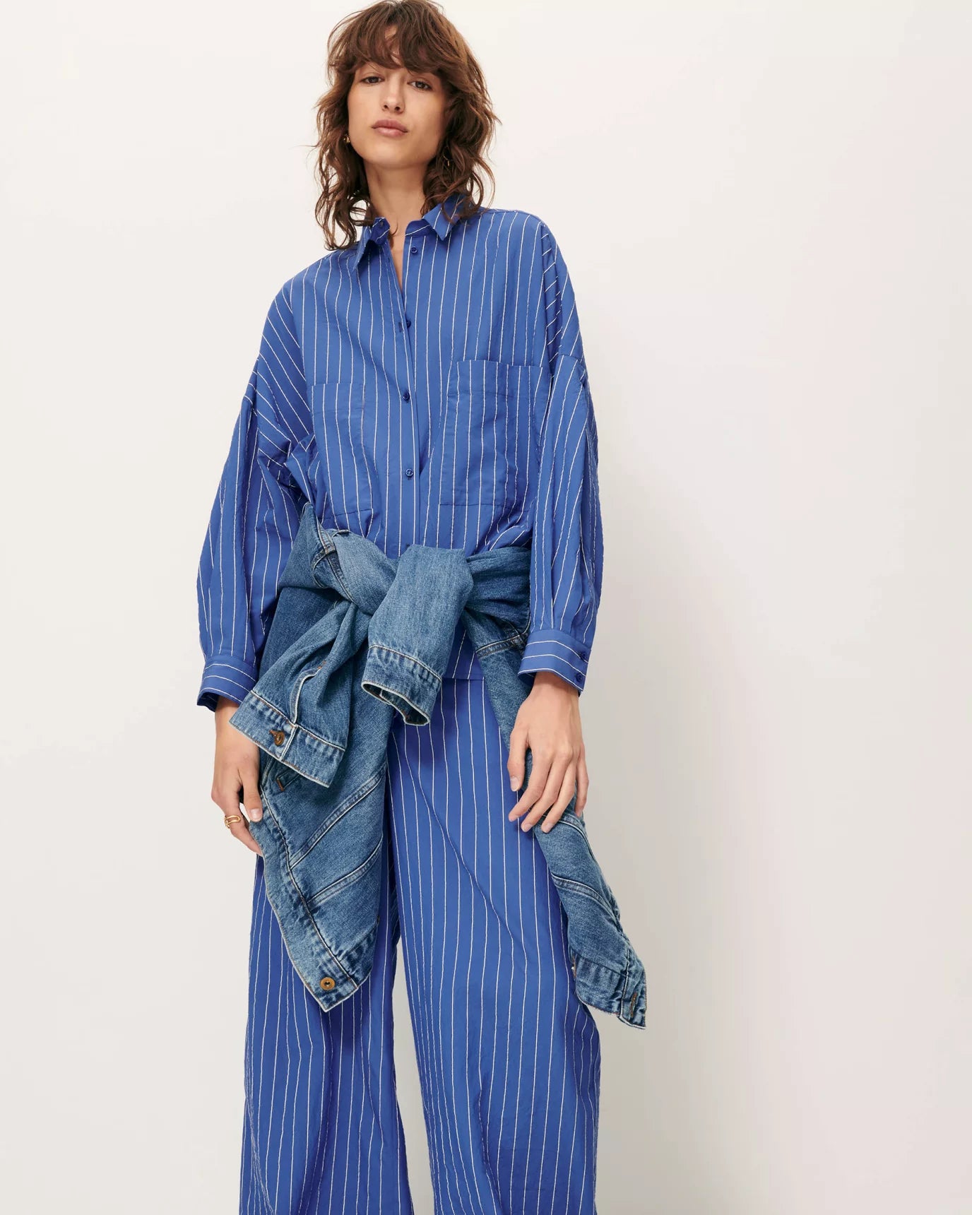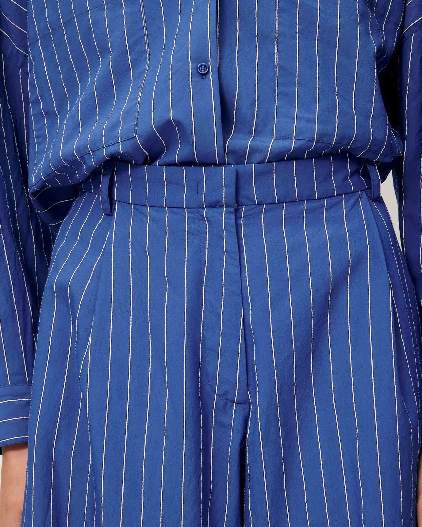 Pleated wide-leg trousers in compact crinkle-effect poplin with dobby stripes, woven in Italy.