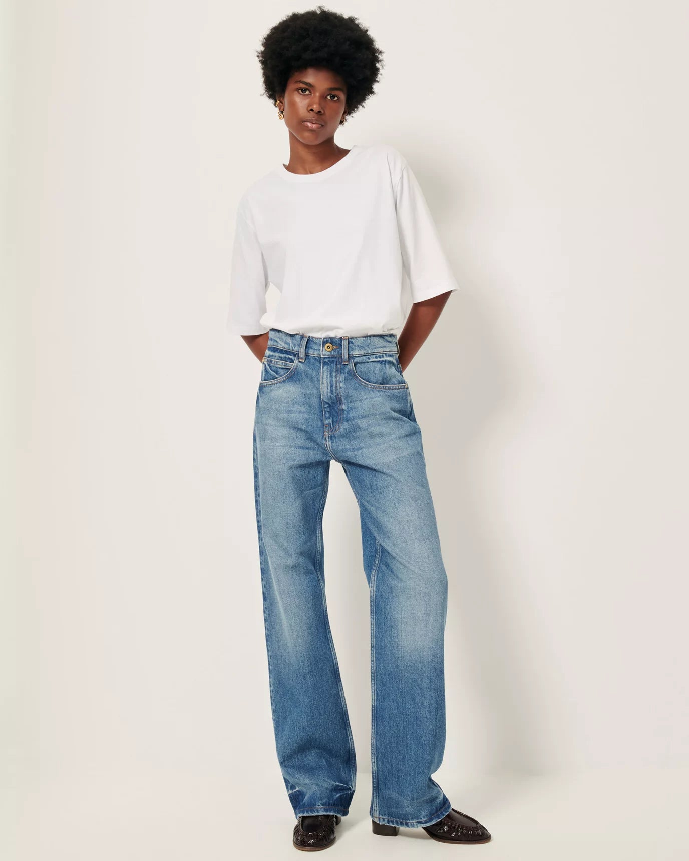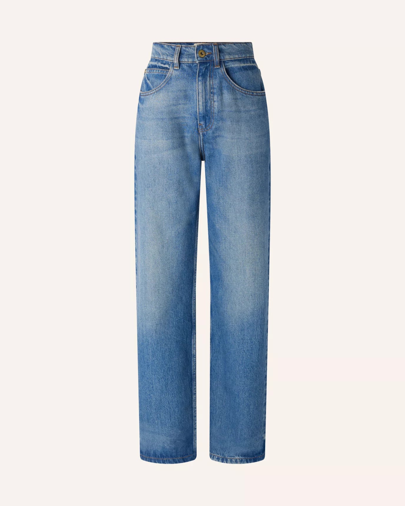 Mid-rise straight-leg jeans, relaxed fit, in authentic-look stonewash denim.